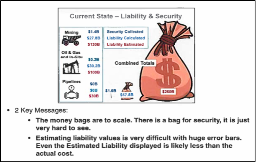 This section repeats much of the same ahistorical narrative already discussed above, again without substantiation. However, it also discusses several “liability funding solutions” that in our view do merit further consideration, including “asset-specific closure financial instruments” that would “ensure closure costs are covered throughout an asset’s lifecycle, improving liquidity, and enabling smoother asset transfers” (at 42 and further elaborated at 43: “A new financial instrument attached to new assets upon creation, ensuring that the new assets will never be orphaned. This would ensure that closure liabilities are considered from the outset of asset development including future production operations.”). This approach should have been adopted when an early version of this ‘security-deposit’ was first considered by Alberta energy regulators in the mid-1980s. Today would be the next best option.