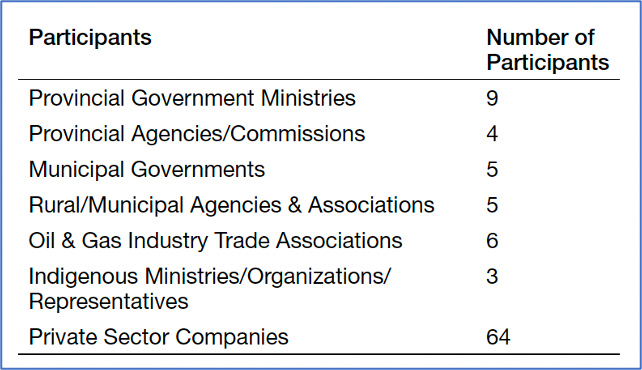 Despite some effort to broaden engagement, the development of the MAS was mostly faithful to the unfortunate but long-standing secretive approach to policymaking in the unfunded closure liability context. Cabinet officials (e.g., ministers and their department staff) were directly involved in organizing the consultation process, with a small selection of government officials, industry lobby organizations, oil and gas corporations, engineers, municipalities, surface rights associations, and landowners. Approximately 200 participants from 97 entities were involved (at 14; see Table 1, below).