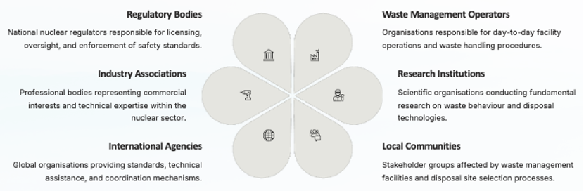 Lastly, Andrew G. Walters, PhD Candidate from the University of Aberdeen, concluded the panel by exploring whether digital platforms and algorithmic systems could one day replace traditional legal oversight in radioactive waste governance. Unlike established legal frameworks, “platform-based” models rely on continuous data, predictive modelling, and real-time monitoring. Digital systems, he argued, enhance precision and adapt more quickly. This is especially true in the complex stakeholder ecosystem that governs waste management (see Figure 4). However, these systems are far from replacing the stability and validity of legal authority, and the frequent need for human judgment still exist. Although digital systems can support coordination amongst actors in the complex stakeholder ecosystem, they cannot replace human deliberation and decision-making.