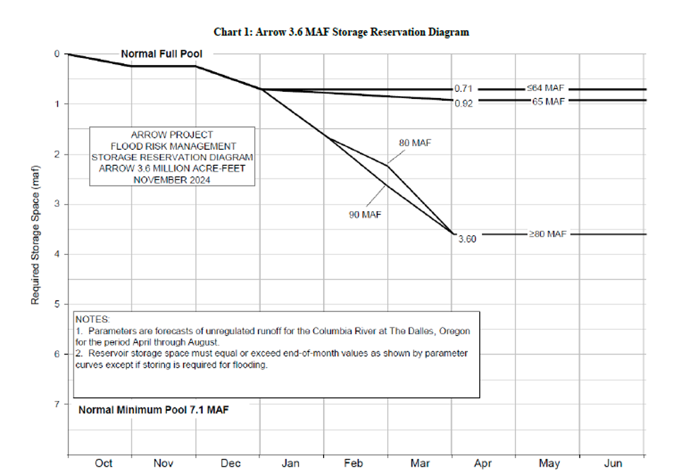 As with the prior FCOPs, the FROP operation at Arrow during the evacuation period is based on forecasts of unregulated runoff at The Dalles, Oregon. The higher the forecast flows the greater the required drawdown of Arrow. This is illustrated by the Storage Reservation Diagram for the reservoir which was included in the Entity Agreement and appears as Chart 1 in the FROP and reproduced below. Hence, when US ACE forecasts unregulated runoff of 80 MAF (or greater) at the Dalles, BC Hydro is required to make the full 3.6 MAF of pre-planned space available at Arrow by the end of March. This is essentially the same as Chart 6 of the old FCOP, although that chart also contains the reminder that, in response to a call from US ACE (that is to say an on-call operation), Canada may be required to evacuate the entire 7.1 MAF of active space at Arrow for flood control. The rules for a call are detailed in s 10.5 of the FCOP-2003 and Article 1 of the Protocol. The omission of this reference in the FROP is consistent with both expiration of the on-call obligations of the original treaty and the recognition that the FROP does not address the called-upon operation at all, but is “without prejudice” to each party’s interpretation of the called-upon operation as described in the treaty.